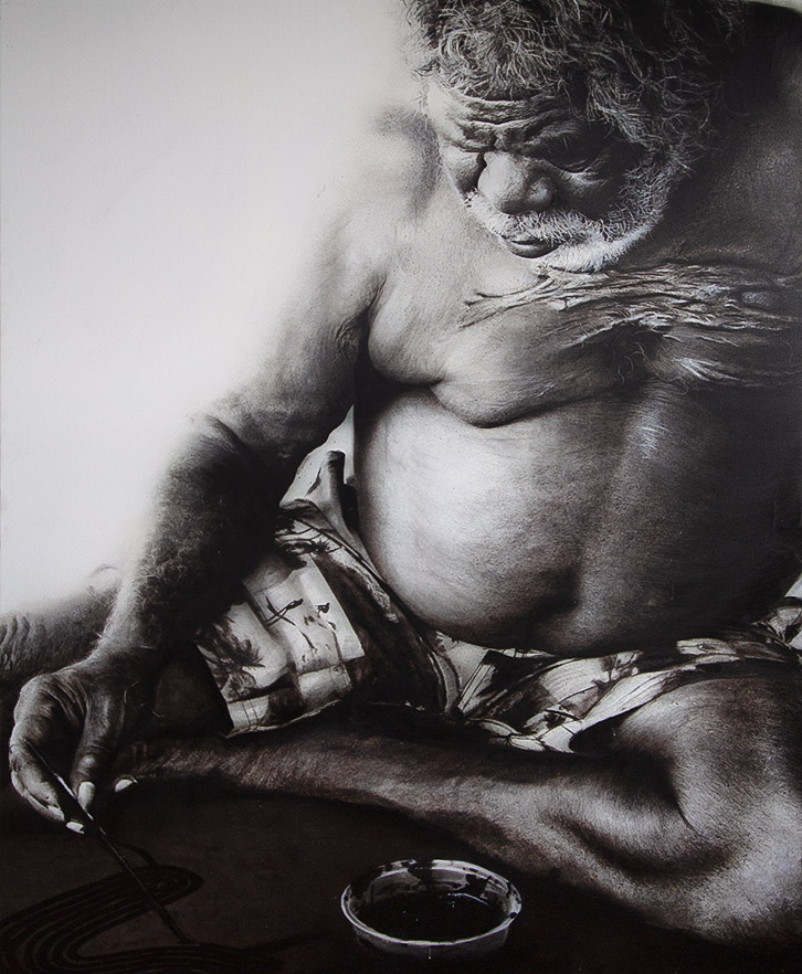 The big lake site of Kaakuratintja (Lake Macdonald), which a large group of Tingari men travelled through on their way east, is often the subject of his paintings. His meticulous geometric drawing is often offset by more rapid, shaking dotting to produce a shimmering surface. In 2004 George won the prestigious 2004 Wynne Prize at the Art Gallery of New South Wales. George has also exhibited in many galleries throughout the past decade.