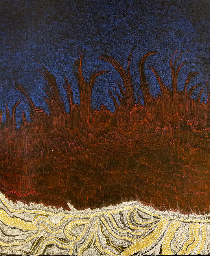 Tjukurpa (Wind Dreaming) is a story of her mother's country at Utantja, a large stretch of sacred land where people go for ceremonial rites. "The wind ceremony forms winds, creates air to cool the lands," she says, explaining that the cooler the land gets, the easier it is for hunting.