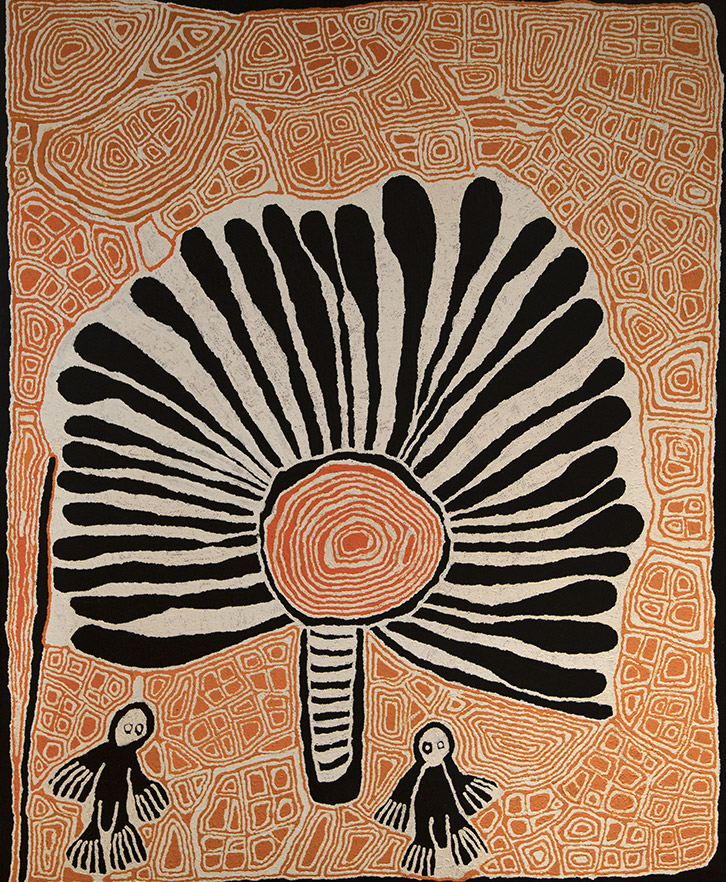 His paintings represent the landscape around Boundary Bore, an outstation in the country for which he is a custodian. Emu Dreaming is one of Kudditji’s inherited ancestral totems; he paints the stories of the travels and law of the Emu ancestors.
