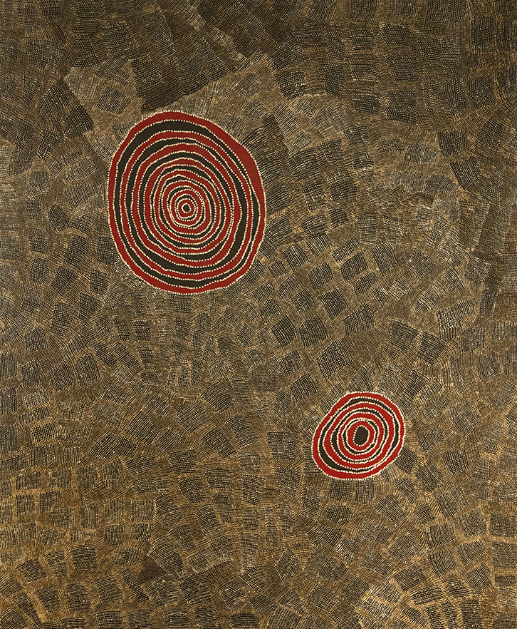 Wentja’s distinctive style displays a mesmerising surface of intricate dots executed using extraordinary precision and consistency. Subtle tonal colours blend with the sometimes dominant iconography of a concentric circle. Her key motif is a large roundel which represents an important rockhole where her family regularly camped.